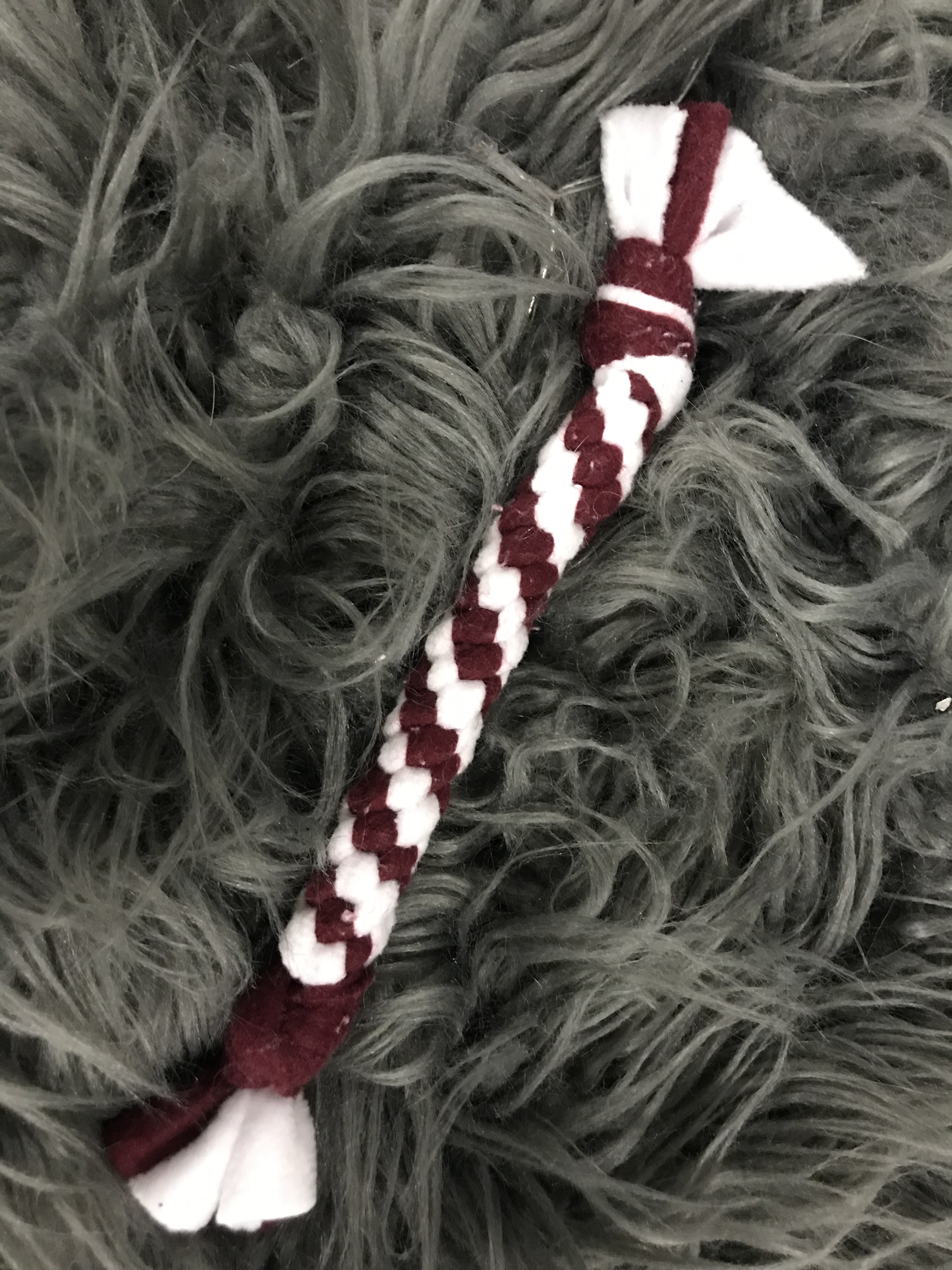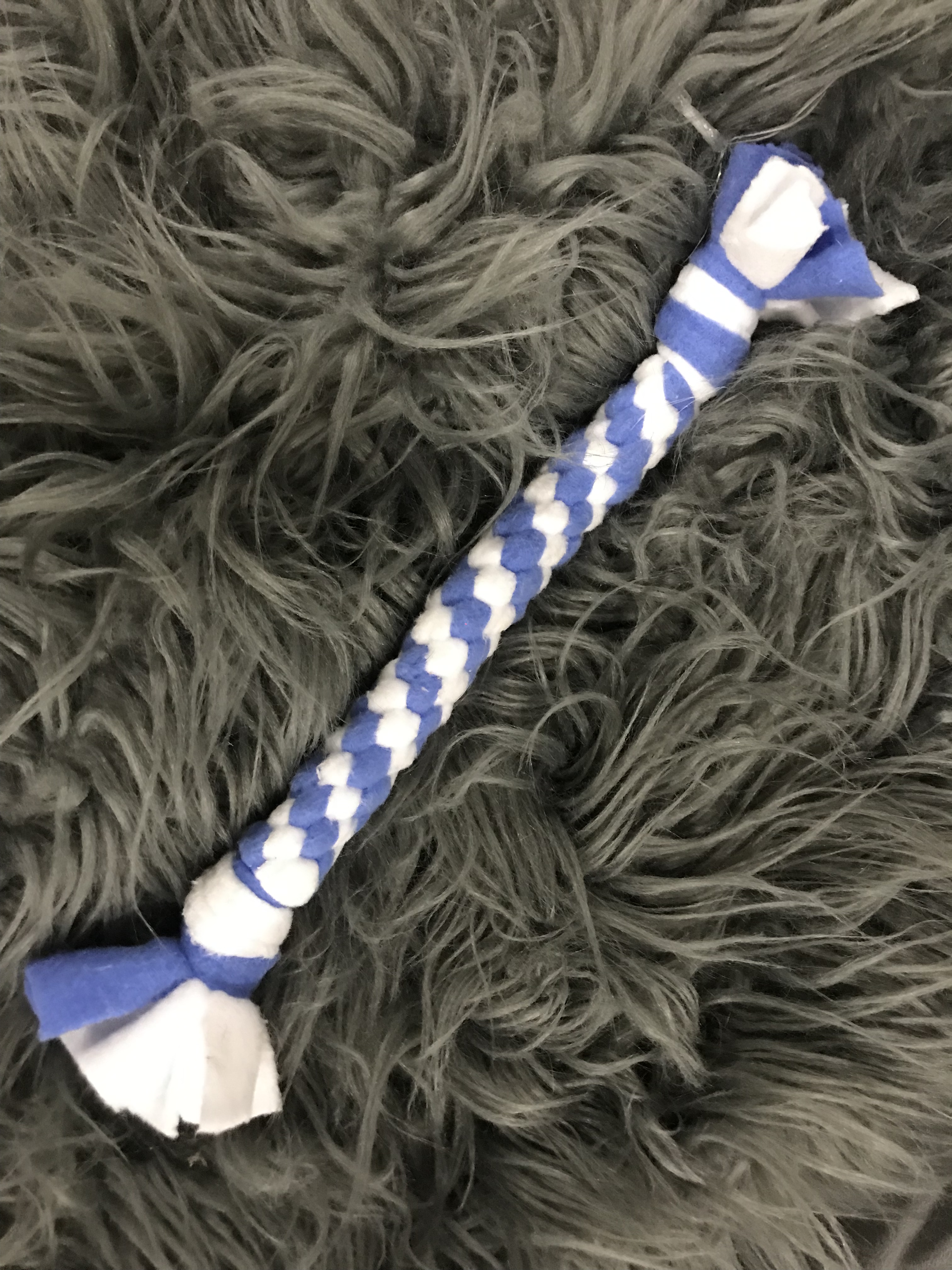 Fleece Tug Toys – made from your choice of colors, then square braided together for a firm hold. These toys are durable and machine washable! Three different size choices: small, medium or large.