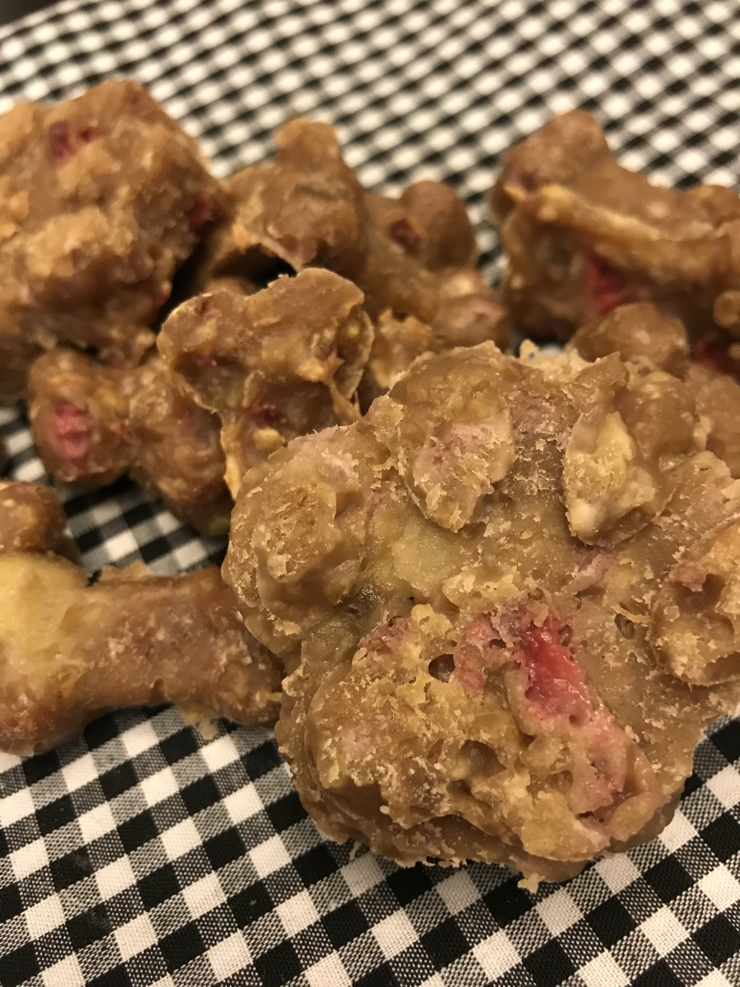 Bear’s, Maple’s, Napa’s- made from peanut butter, honey, eggs, and flour with a frosted top/center. The frosting ingredients can be seen below. These have been the favorites with our dogs.